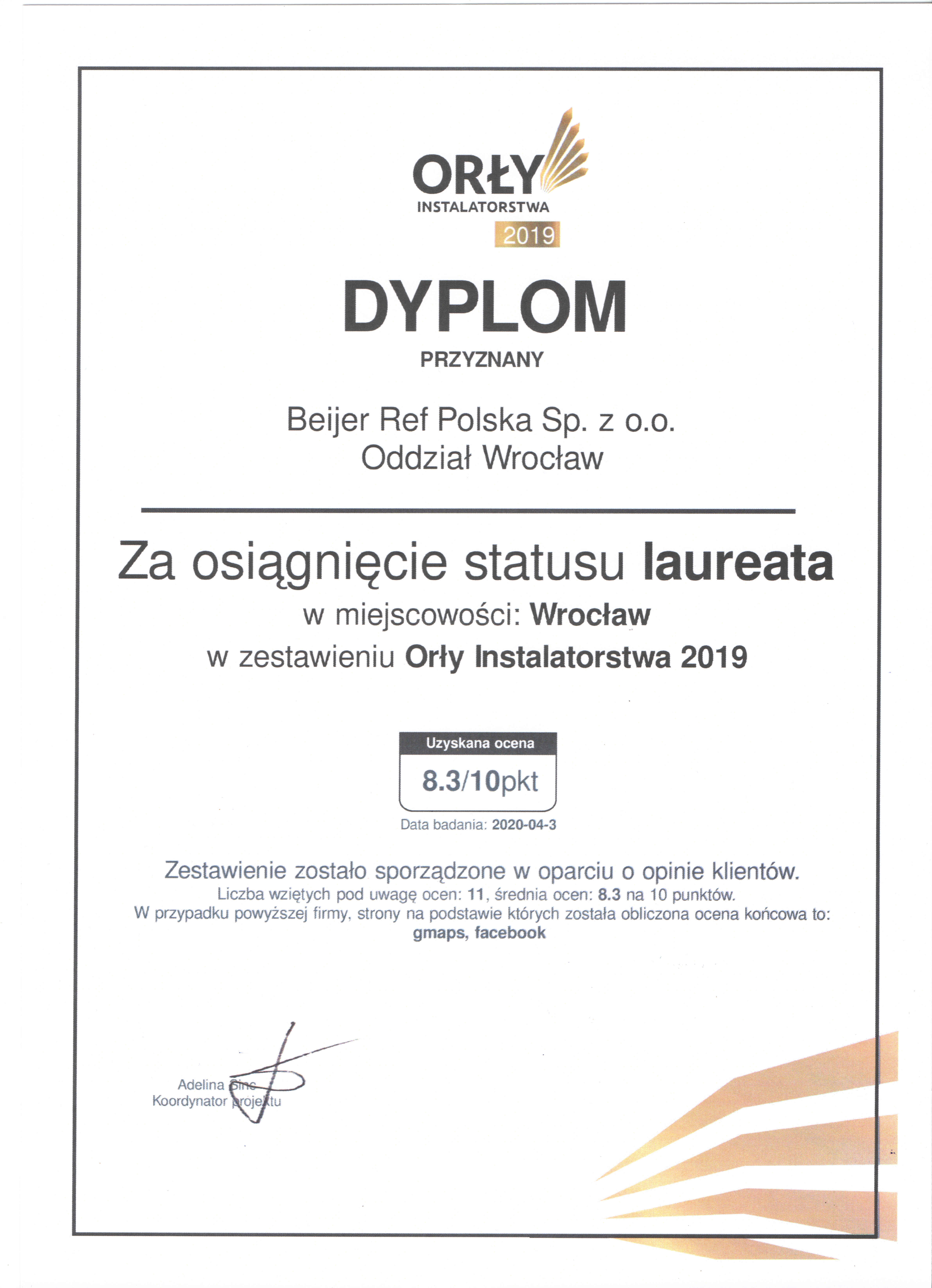 Miło nam poinformować, że nasz oddział we Wrocławiu Beijer Ref Polska, po raz drugi z rzędu, został laureatem plebiscytu Orły Instalatorstwa 2019.